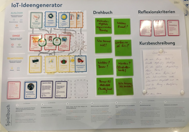 Ausgehend von einem definierten Szenario und Zielgruppe wählt das Team dazu passende Dinge aus und fügt ihnen gewünschte Dienste und Interaktionen zu. Im Anschluss werden geeignete Sensoren, Verbindungen der Dinge und Reaktionen bzw. Feedback an die Nutzer der Idee bestimmt. Das Ergebnis wird zum Schluss in Form eines Elevator Pitches festgehalten.