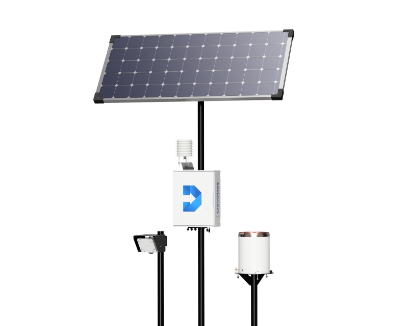 The Develiot Urban Air Quality Monitoring Station equipped with a wide range of sensors such as air quality (NO2, SO2, O3, CO, NH3, H2S, PH3, Cl2, HCl, HF, O2, CH2O, C2H4, C6H6, H2, PM10, PM2.5, PM1.0), CO2, noise level, temperature, humidity, pressure, wind speed, wind direction, and precipitation. It provides GSM, NBIoT, and LoRaWAN wireless connectivity for sending data.