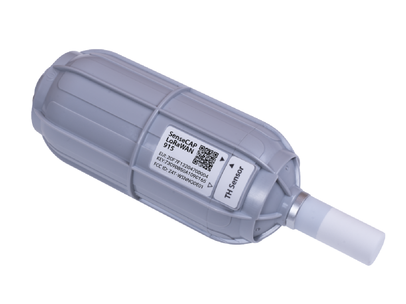 The Seeed Studio SenseCAP Wireless Air Temperature and Humidity Sensor measures temperature and humidity in the atmosphere. It's designed with a 2-in-1 sensor, a custom battery, and an IP66 enclosure, optimized for outdoor use cases that need reliable data collected over years. The collected data is sent over the LoRaWAN® network for further processing and decision making.