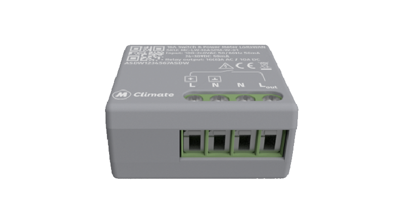 The МClimate 16ADS is a miniature device that features a 16A dry relay. The device is small enough to fit behind most wall switches and outlets. The device operates in LoRaWAN Class C, features FUOTA (Firmware Upgrades Over The Air) and has overheating protection
