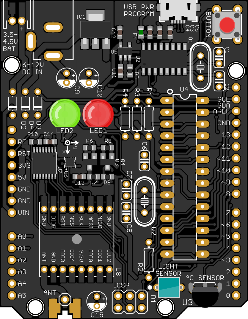 Learn about soldering, electronics and programming using this development board. Based on the Arduino Uno, supercharged with an on-board LoRaWAN modem and various sensors.