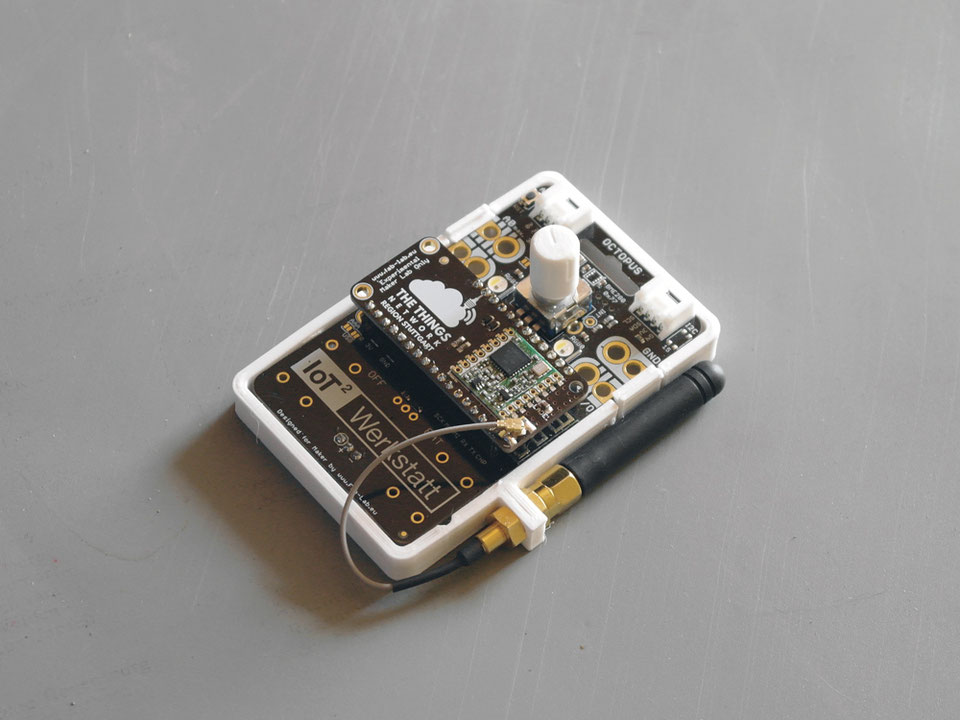 Der IoT Octopus von Guido Burger ist ein wahres Allroundtalent. Er verfügt nicht nur über analoge und digitale Ein- und Ausgänge, sondern auch über einen Steckplatz für Adafruit Featherwings, was ihn praktisch unendlich erweiterbar macht (auf dem Foto ein TTN Wing mit Antenne). Außerdem onboard ist ein Bosch BME680 Umweltsensor (Temperatur, Luftfeuchte, Luftdruck und Luftqualität).