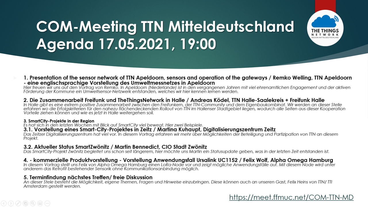 hiermit möchten wir Euch recht herzlich zum nächsten Community-Treffen am 17.05.2021, 19:00 Uhr via Jitsi einladen. Es ist uns gelungen, eine spannende Agenda zusammen zustellen. Hier der Link: https://meet.ffmuc.net/COM-TTN-MD